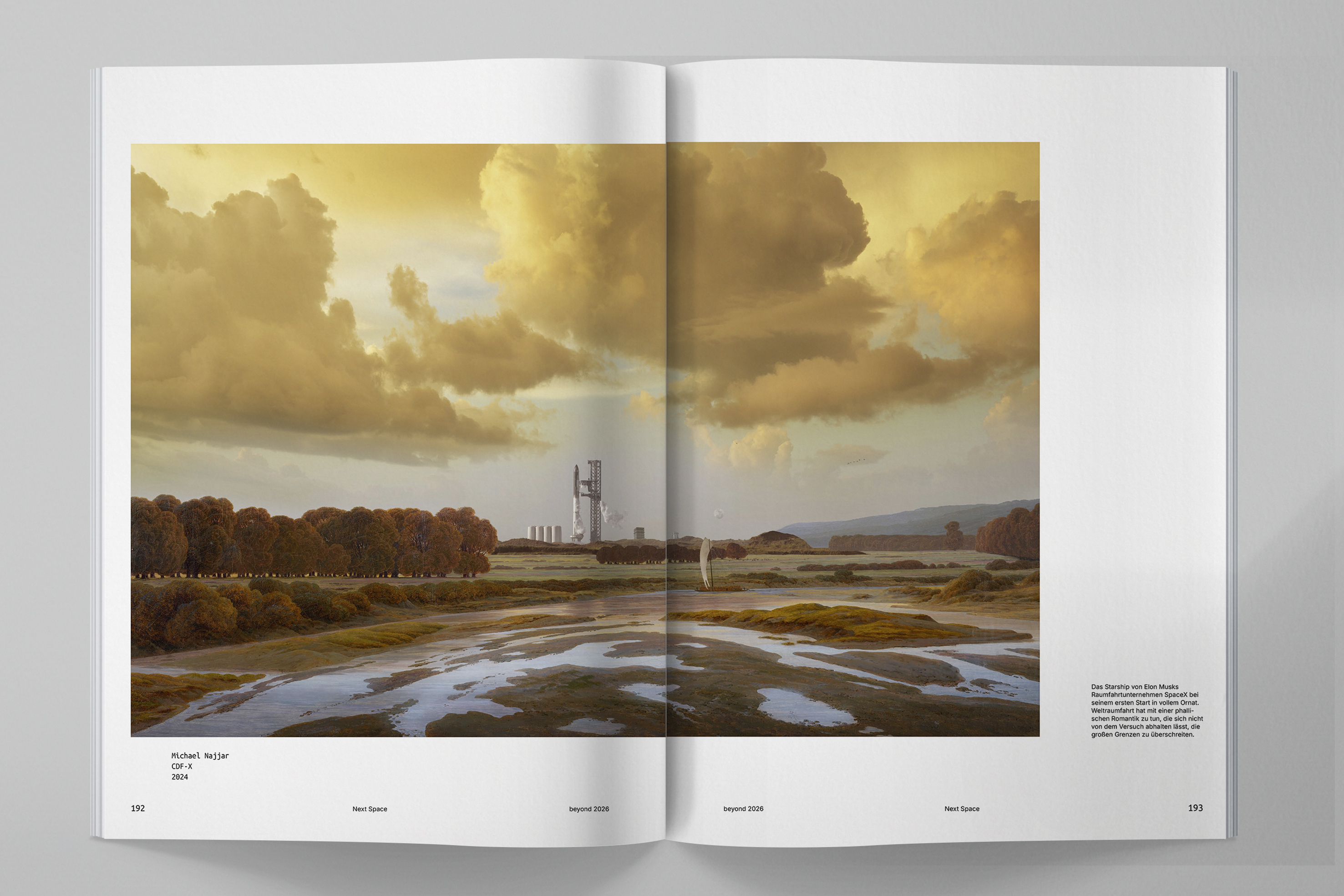 Naturally, the book’s gaze toward the future also extends into outer space. The chapter "Next Space" focuses on the future of humanity in space. In recent years, technological innovations have led to a dynamic expansion of human activities beyond Earth. As a result, civilizational, ethical, and geopolitical questions are increasingly coming into focus, calling for a new discourse on the expansion of our species beyond the planet. For this chapter, Matthias Horx has selected numerous images from Michael Najjar’s fascinating body of work “outer space”.